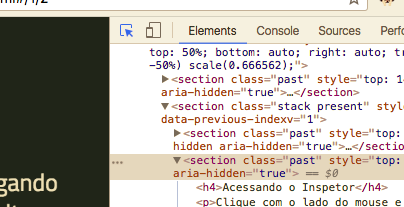 Acesse a aba "Elementos" do Inspetor e continue navegando pelo site. Observe o código se modificar enquanto você altera o comportamento da interface.